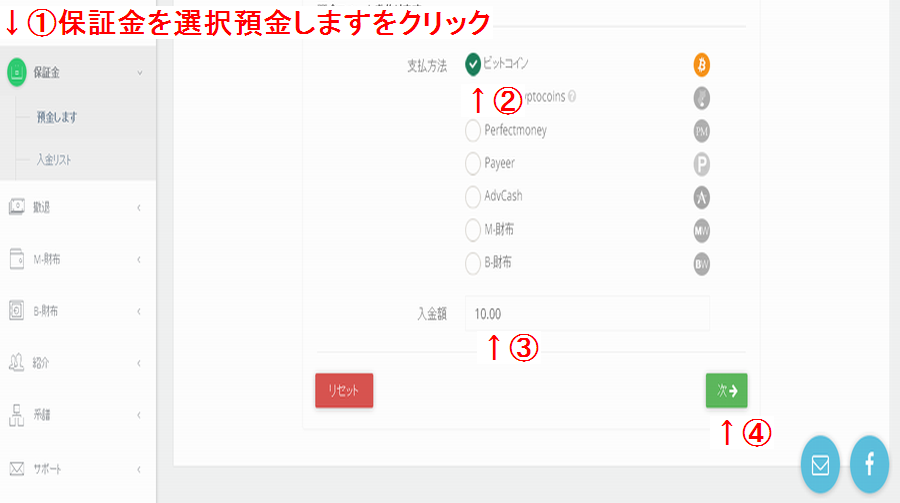 ①保証金を選択、預金しますをクリック
