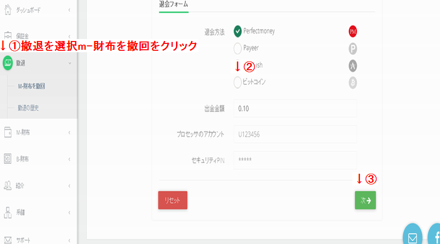 ①撤退を選択しm-財布撤回をクリック